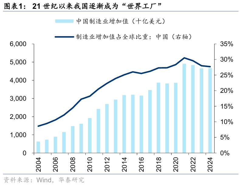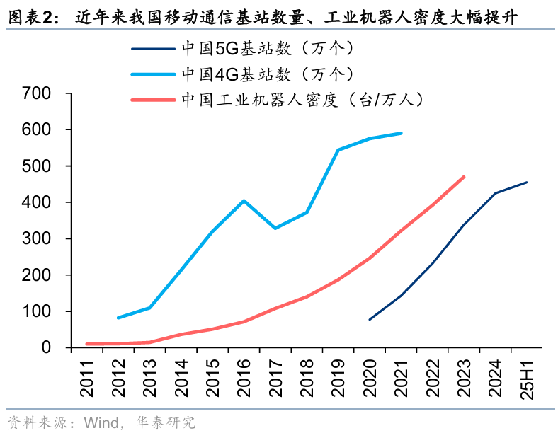2024年,我国制造业增加值占全球比重从2004年的8.6%提升至27.7%,占国内GDP的比重维持在25%左右(24.9%),制造业规模连续15年位居世界第一。与此同时,信息化、数字化、智能化程度持续提升,截至25H1,累计建成5G基站454.9万个,位居世界第一;截至2023年,工业机器人密度提升至470台/万人,四年时间接近翻倍,超越德国和日本、跃居全球第三;重点工业企业关键工序数控化率达到了58.6%,数字化研发设计工具普及率达到了77%。