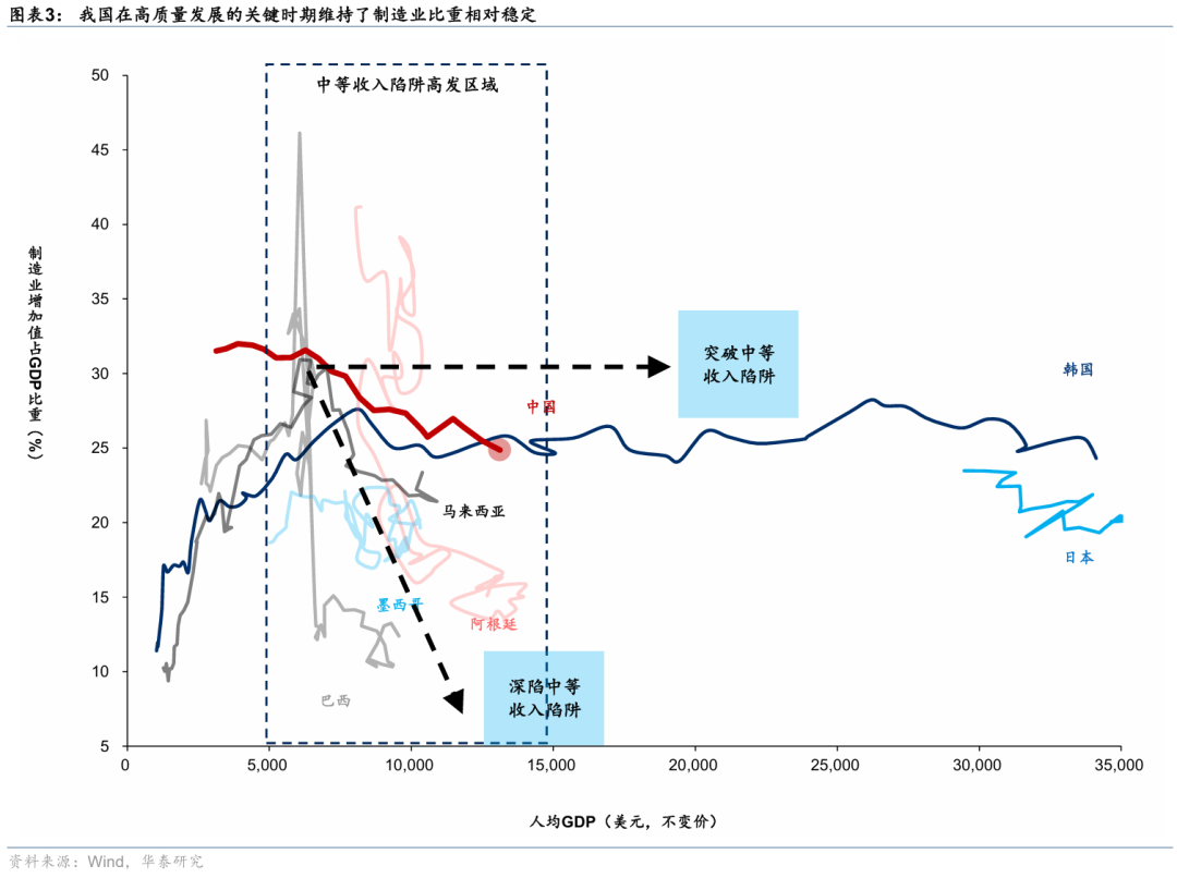 产业基础上,我国拥有全球最完备的工业体系,且信息化程度持续提升。我国拥有41个工业大类、207个工业中类、666个工业小类,是世界上唯一拥有联合国产业分类目录中全部工业门类的国家。我国正处于实现高质量发展的重要时期,从大量国家的经验上看,过早过快去工业化往往使得失业率上升、经济增长放缓,陷入“中等收入陷阱”,而维持制造业比重是跨越“中等收入陷阱”的关键因素之一。