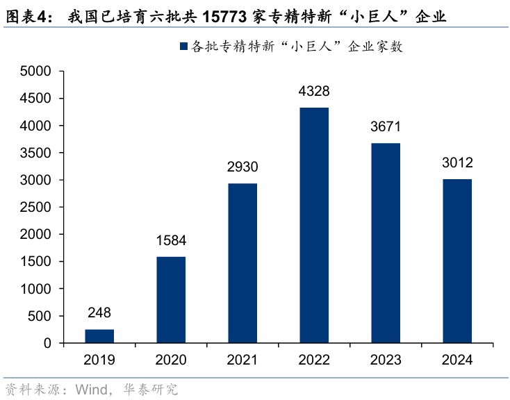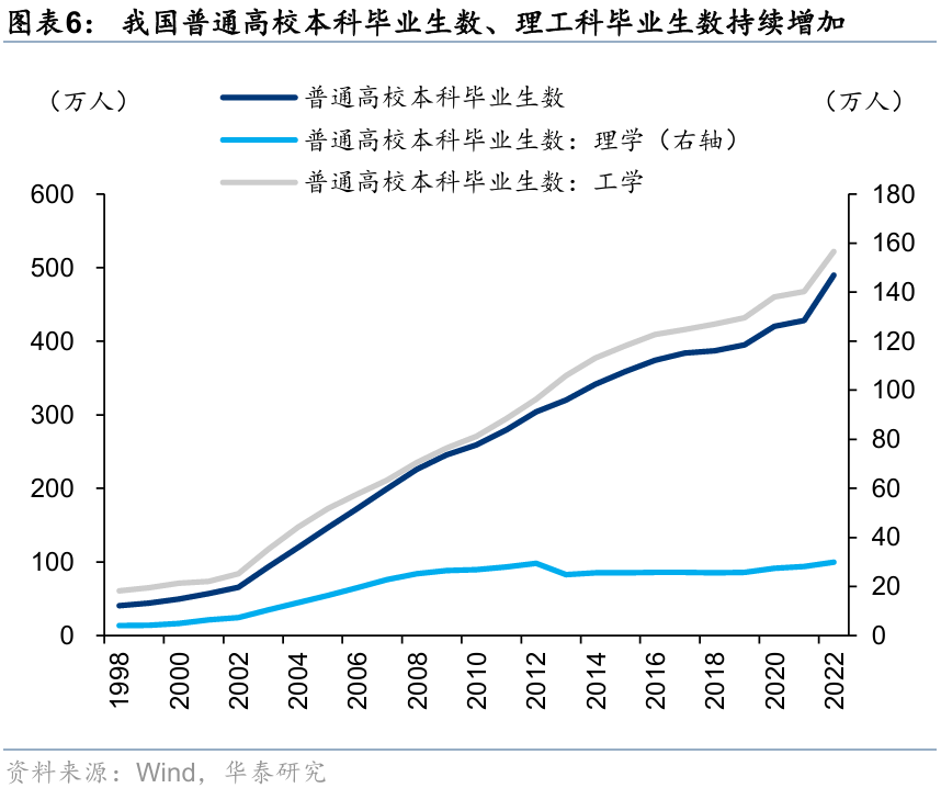 2)创新环境上,大力支持中小创新型企业发展,截至2024年我国已培育六批共15773家专精特新“小巨人”企业;从“人口红利”转向“工程师红利”,根据GTCI,我国已成为中等偏上收入国家或地区中人才竞争力排名第一的国家,普通高校本科毕业生、理工科毕业生人数持续增加,逐渐形成产学研协同效应;