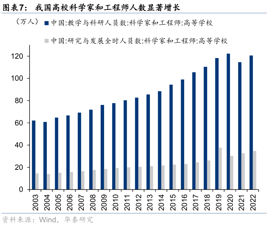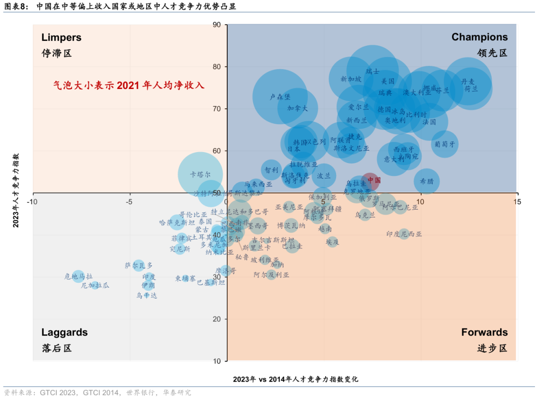 人才储备方面,近年来中国从“人口红利”转向“工程师红利”,普通高校本科毕业生数、理工科毕业生数持续增加,高校科学家和工程师人数亦显著增长;根据2024年11月最新公布的全球人才竞争力指数(GTCI),2023年中国人才竞争力指数提升至52.6,在中等偏上收入国家或地区中排名第一。