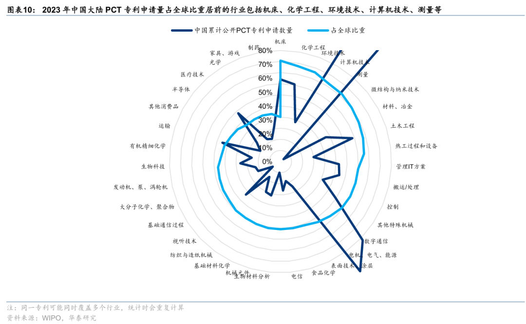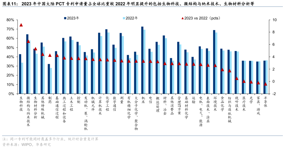 专利视角,横向来看,2023年中国大陆PCT专利申请量居前的行业包括计算机技术、测量、电机/电气/能源、数字通信、机床等,占全球比重居前的行业包括机床、化学工程、环境技术、计算机技术、测量等,制药、游戏、光学、医疗技术、半导体等专利申请量占比仍有提升空间;纵向来看,2023年中国大陆专利申请量占全球比重较2022年明显提升的行业包括生物科技、微结构与纳米科技、生物材料分析、其他特殊机械、制药等,较2022年回落的行业包括半导体、游戏、光学。