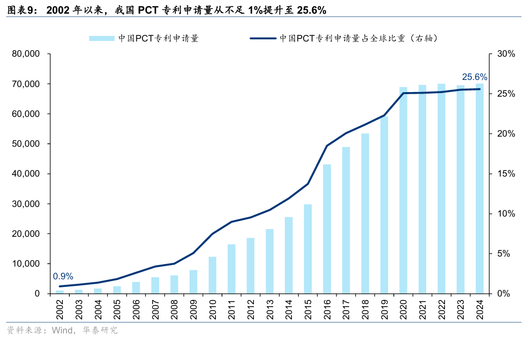 创新能力上,我国专利数量及全球占比明显提升,逐渐从技术接收方转为技术提供方甚至标准制定者。2002年以来,我国PCT专利申请量占全球比重从不足1%,提升至2024年的25.6%,是申请量最大的来源国,华为申请量位列全球申请人第一,宁德时代跻身前五;每万人口高价值发明专利拥有量达到14件,提前完成国家“十四五”的规划预期目标。