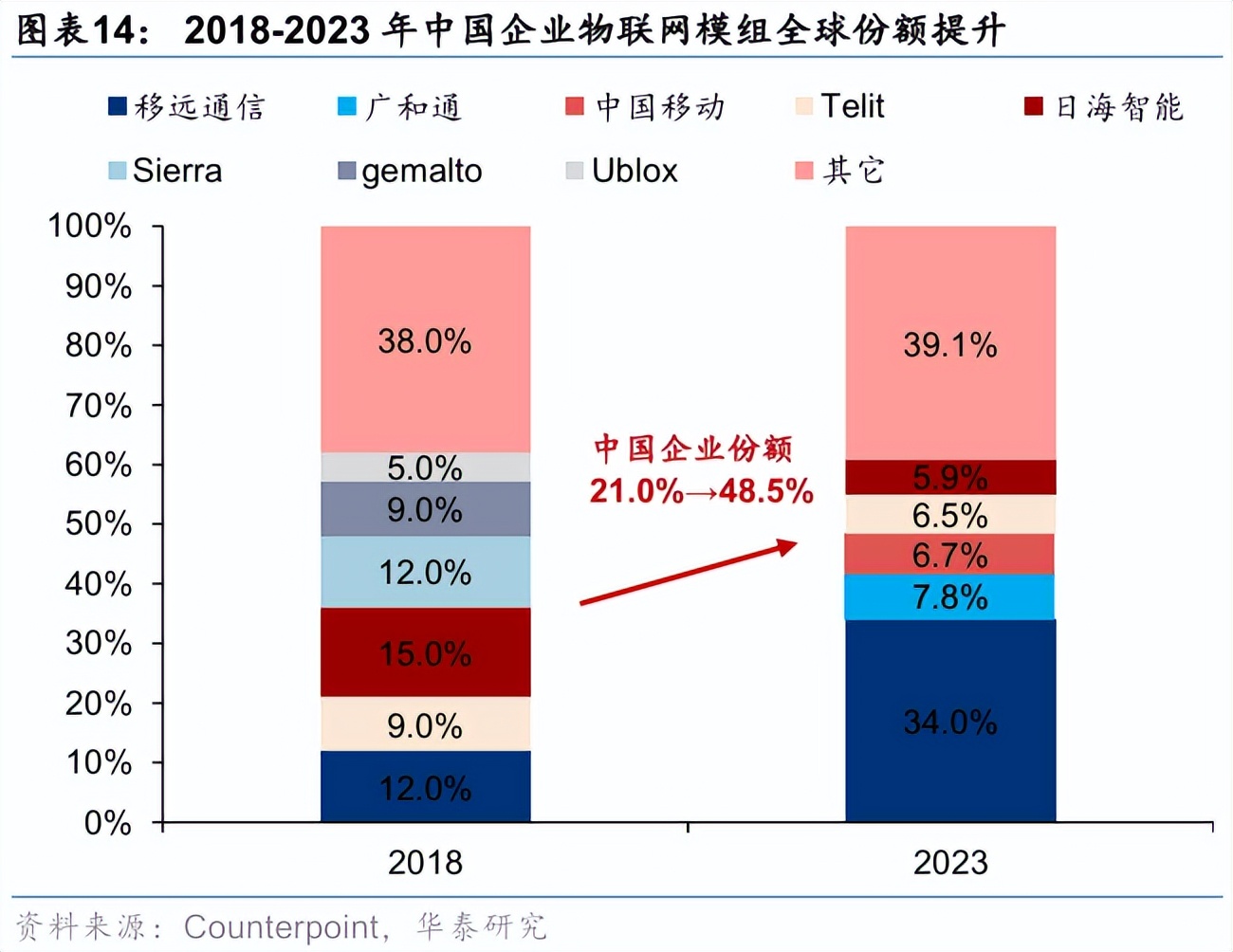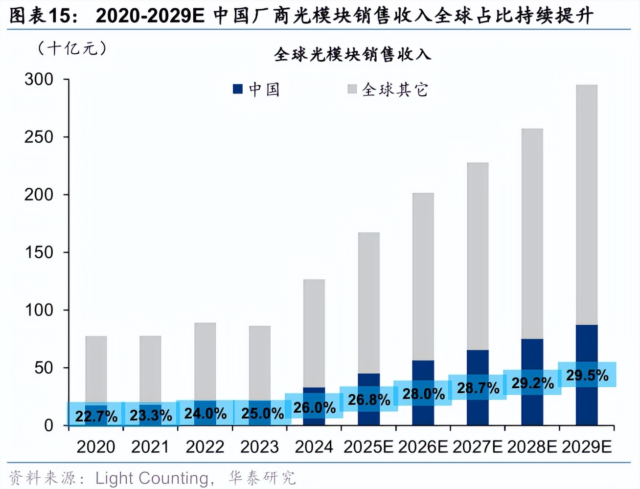 市场地位视角:考察泛科技领域各产业链细分环节中国企业全球份额和全球前五大龙头中中国企业数量,国内在新能源、工控、消费电子、通信设备、智能驾驶、游戏等领域具备较强竞争力,部分细分环节如储能、激光雷达、光伏组件、光伏逆变器、锂电铜箔、锂电池、四足机器人、域控制器、磷酸铁锂、三元材料、物联网模组、光模块等全球份额居前;半导体、机器人、新材料等领域仍有提升空间,但其中部分细分环节如半导体封测、AI芯片、四足机器人、碳纤维等或率先“突围”。以物联网模组为例,根据Counterpoint,2018-2023年中国企业物联网模组全球份额从21.0%提升至48.5%,已占据半壁江山;以光模块为例,根据Light Counting,2020-2024年中国厂商光模块全球份额由22.2%提升至26.0%,预计2029年将提升至29.5%,部分厂商获得英伟达等下游龙头重大订单。