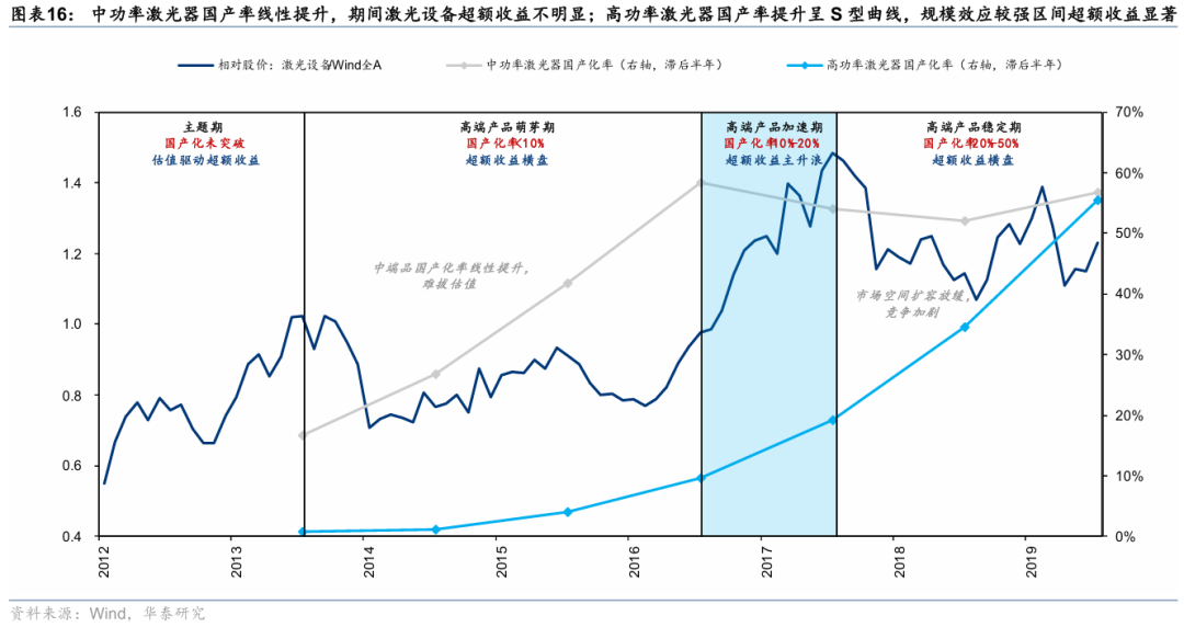 复盘过往实现国产化的行业案例,低技术壁垒的产品国产化率提升通常呈线性,例如中功率光纤激光器等,国产替代对估值的贡献较小。高技术壁垒的产品国产化率提升通常呈S型曲线,如高功率光纤激光器,国产化率在10-50%区间规模效应较强,通常出现估值和业绩的戴维斯双击。国产化率过高则国产化空间不大(如面板),过低则可能意味着关键技术存在“卡脖子”压力(如光刻机)。近年来,半导体、医疗器械、智能驾驶、新材料、自动化、工业软件等部分细分环节国产率近年来明显提升。