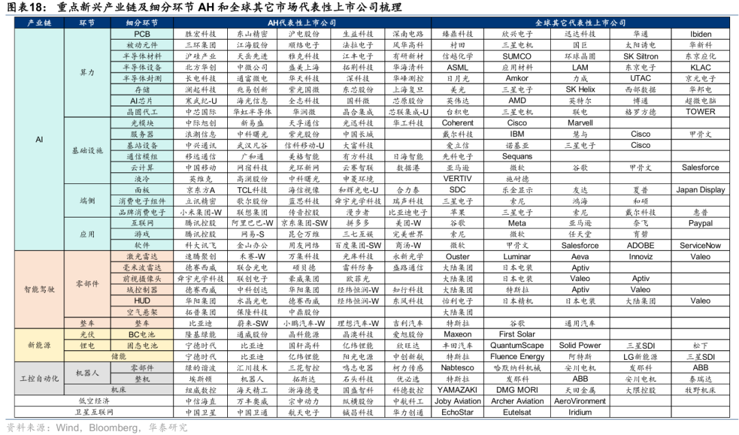 我们筛选了当前渗透率处于“奇点时刻”、或政策和产业端催化加持下有望进入“奇点时刻”的新兴产业链及细分环节,主要包括AI、智能驾驶、人形机器人、低空经济、BC电池、固态电池等。进一步,我们梳理了上述领域AH和全球其它市场代表性上市公司,进行财务层面的横向比较。综合来看,AH科技股在自由现金流和盈利质量上仍有提升空间,但业绩增速、研发投入和资本开支强度上不乏亮点。综合来看,智能驾驶、新能源、工控自动化等领域AH科技股具备一定优势,AI等部分领域尚在追赶,但半导体设备/材料、AI芯片、卫星互联网等细分环节已呈现“加速”态势。最后,基于上述分析,我们结合华泰行业团队推荐,从重点环节AH龙头中筛选除了30只个股形成华泰策略AH科技30组合,供投资者参考。