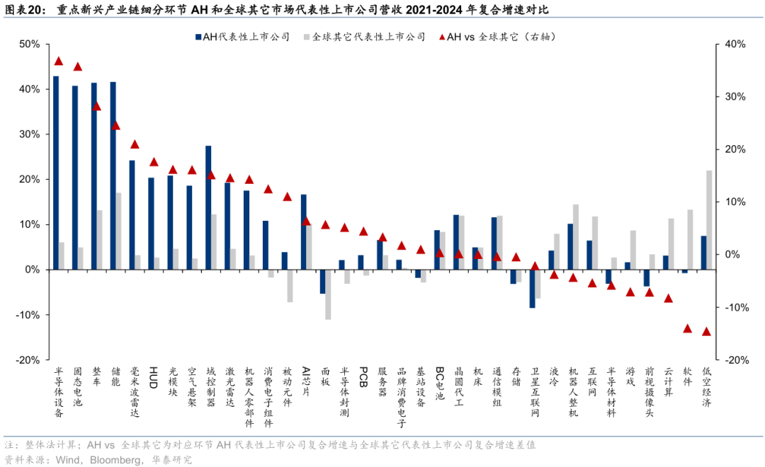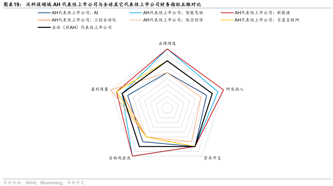 通过上市公司财务和估值指标的横向比较,可以进一步观察中国科技股当前全球竞争力情况。为了简化样本,我们筛选了当前渗透率处于“奇点时刻”、或政策和产业端催化加持下有望进入“奇点时刻”的新兴产业链及细分环节,主要包括AI、智能驾驶、储能、人形机器人、低空经济、BC电池、固态电池等,并梳理了上述领域AH和全球其它市场代表性上市公司(以下简称“AH科技股”和“全球其它科技股”),进行财务和估值层面的横向比较。