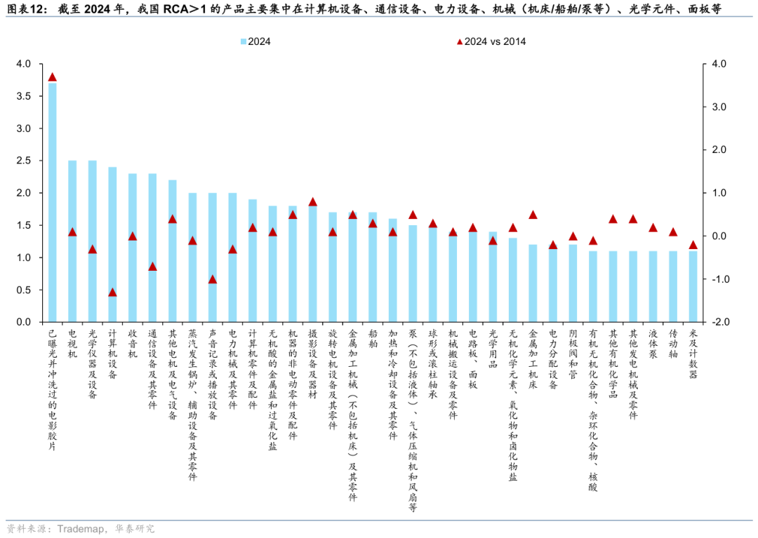 贸易视角,以显示性比较优势指数RCA衡量各产品在全球分工中出口竞争力,截至2024年,我国泛科技领域具备比较优势的主要包括计算机设备、通信设备、电力设备、机械(机床/泵等)、光学元件、面板等,较2014年提升幅度较大的主要集中在先进制造和新材料,如机床、化工品等。