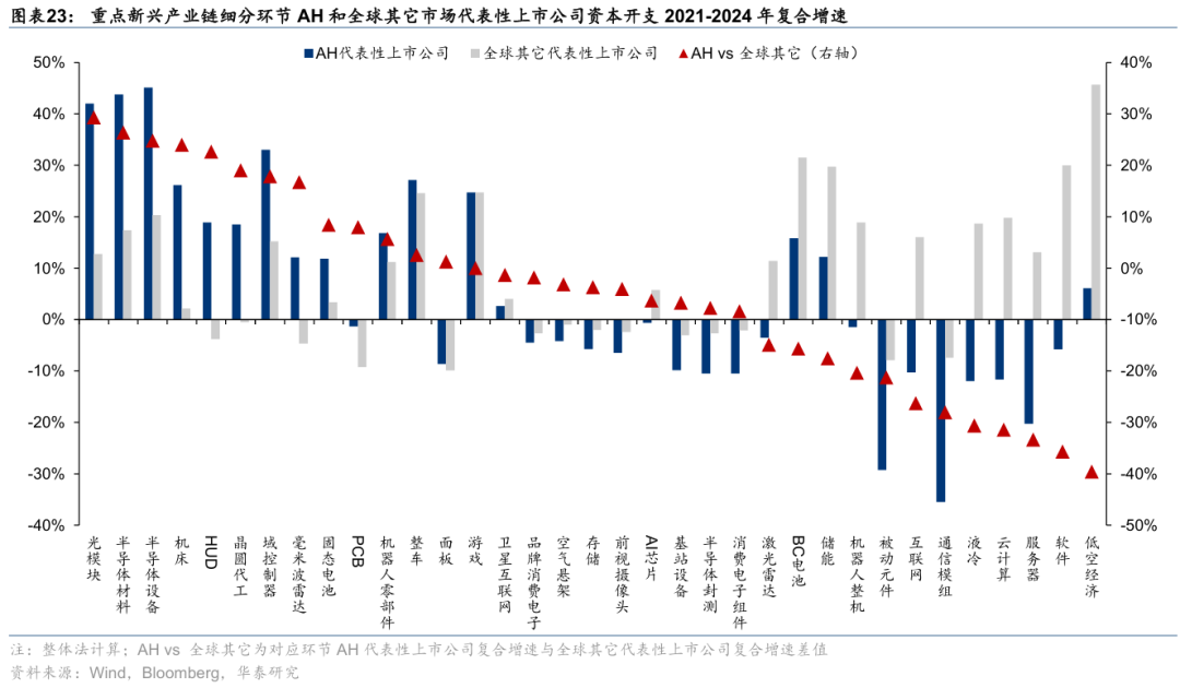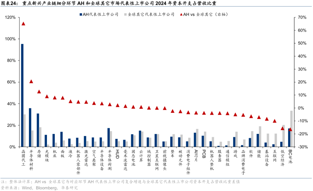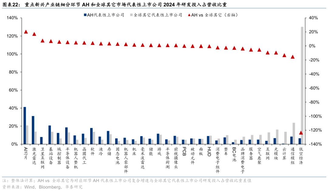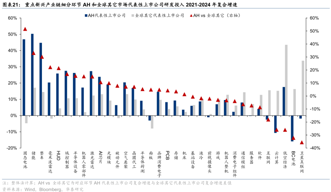 2)研发投入:增速视角,考察研发投入2021~2024年复合增速,产业链层面,AH科技股在智能驾驶、新能源、工控自动化上领先,AI、低空经济、卫星互联网等仍有提升空间;细分环节中,PCB、储能、固态电池、整车、域控制器等AH科技股复合增速居前,固态电池、储能、整车、毫米波雷达、HUD等AH科技股复合增速相对全球其它科技股领先;相对强度视角,考察2024年研发投入占营收比重,产业链层面,AH科技股在新能源、工控自动化上研发强度与全球其它科技股持平,AI、智能驾驶、低空经济、卫星互联网等领域仍有提升空间;细分环节中,AI芯片、激光雷达、基站设备、半导体设备、软件等AH科技股研发强度居前,AI芯片、激光雷达、卫星互联网、基站设备、域控制器等AH科技股研发强度显著高于全球其它科技股。