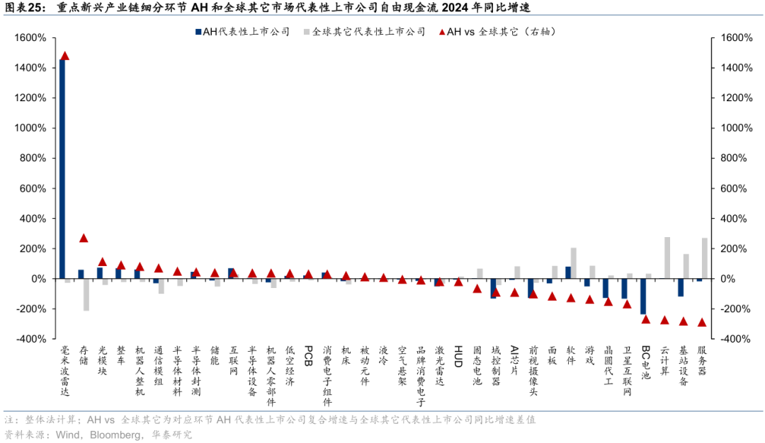 4)自由现金流:增速视角,考察自由现金流2024年同比增速,产业链层面,AH科技股在智能驾驶、新能源、低空经济上现金流状况改善幅度更高,在AI、工控自动化、卫星互联网上现金流状况仍有改善空间;细分环节中,毫米波雷达、软件、光模块、互联网、智能驾驶整车等AH科技股自由现金流同比增速居前,毫米波雷达、存储、光模块、智能驾驶整车、机器人整机等AH科技股自由现金流同比增速相对全球其它科技股领先。