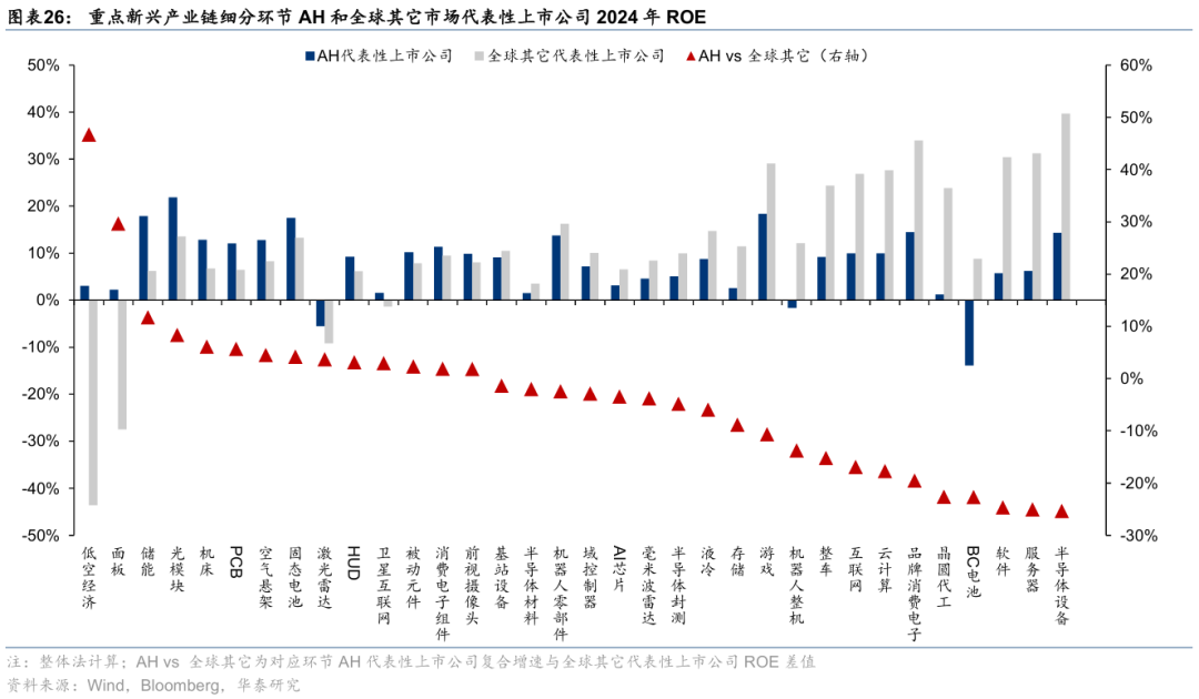5)盈利质量:考察2024年ROE,产业链层面,AH科技股在新能源、低空经济、卫星互联网等领域占优,在AI、智能驾驶、工控自动化等领域有待提升;细分环节中,光模块、游戏、储能、固态电池、品牌消费电子等AH科技股ROE居前,低空经济、面板、储能、光模块、机床等AH科技股ROE较全球其它科技股具备优势。
