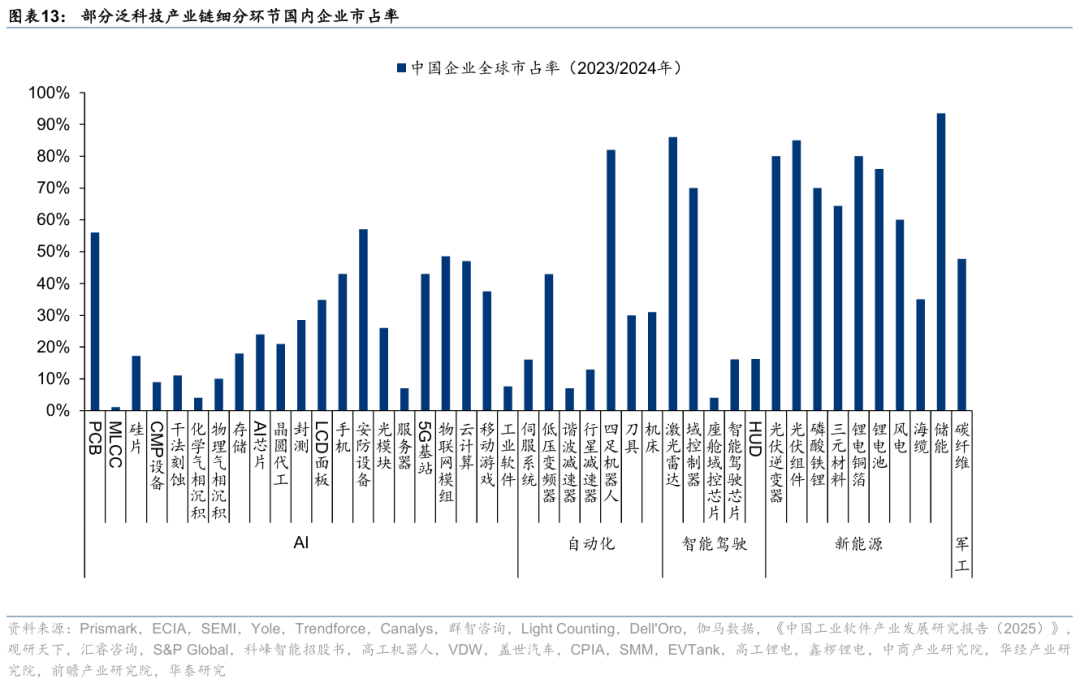 市场地位视角,考察泛科技领域各产业链细分环节中国企业的全球份额,国内在新能源、工控、消费电子、通信设备、智能驾驶、游戏等领域具备较强竞争力,部分细分环节如储能、激光雷达、光伏组件、光伏逆变器、锂电铜箔、锂电池、四足机器人、域控制器、磷酸铁锂、三元材料、物联网模组、光模块等全球份额居前;半导体、机器人、新材料等领域仍有提升空间,但其中部分细分环节如半导体封测、AI芯片、四足机器人、碳纤维等或率先“突围”。