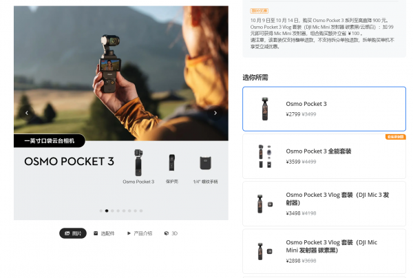拆解本轮降价的具体产品来看,大疆本次从10月9日开始持续到10月14日的降价幅度的确不少,其中Pocket 3标准版直降700元(3499→2799元),Action 4最高降1129元,Mini4 PRO降价1478元。
