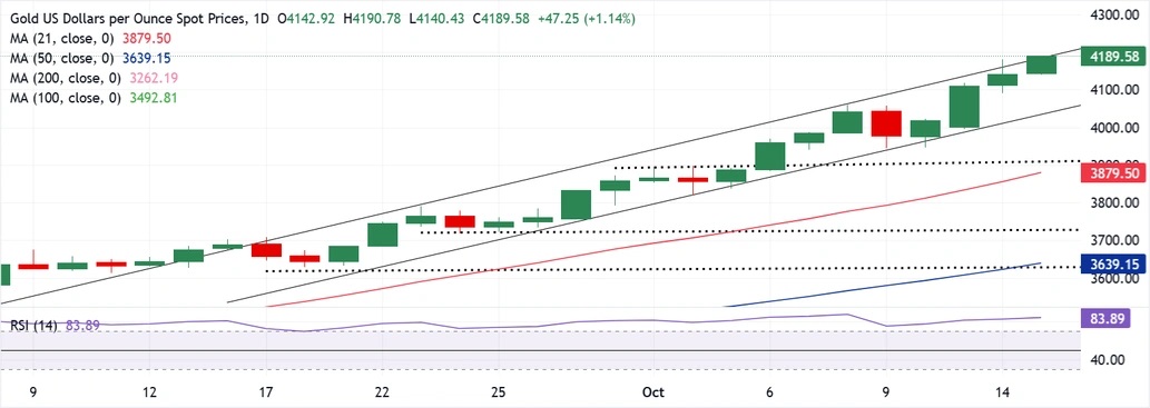 24K99讯 周三(10月15日)亚市尾盘,现货黄金维持日内暴涨走势,目前金价位于4192美元/盎司附近。FXStreet高级分析师Dhwani Mehta撰文,对金价技术走势进行分析。