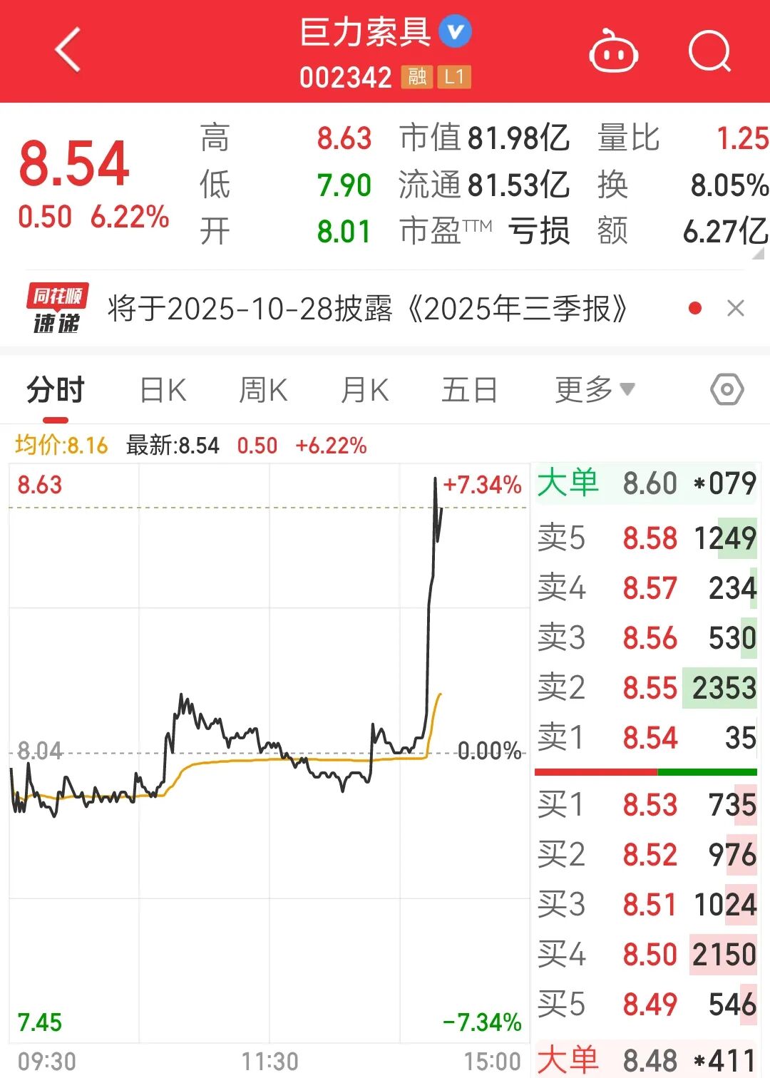 10月16日午后,约14:10,巨力索具(002342)股价直线拉升,盘中一度涨超7%。其他海洋经济概念股如中科海讯、深水海纳、海兰信、神开股份、克莱特等均有明显拉升。
