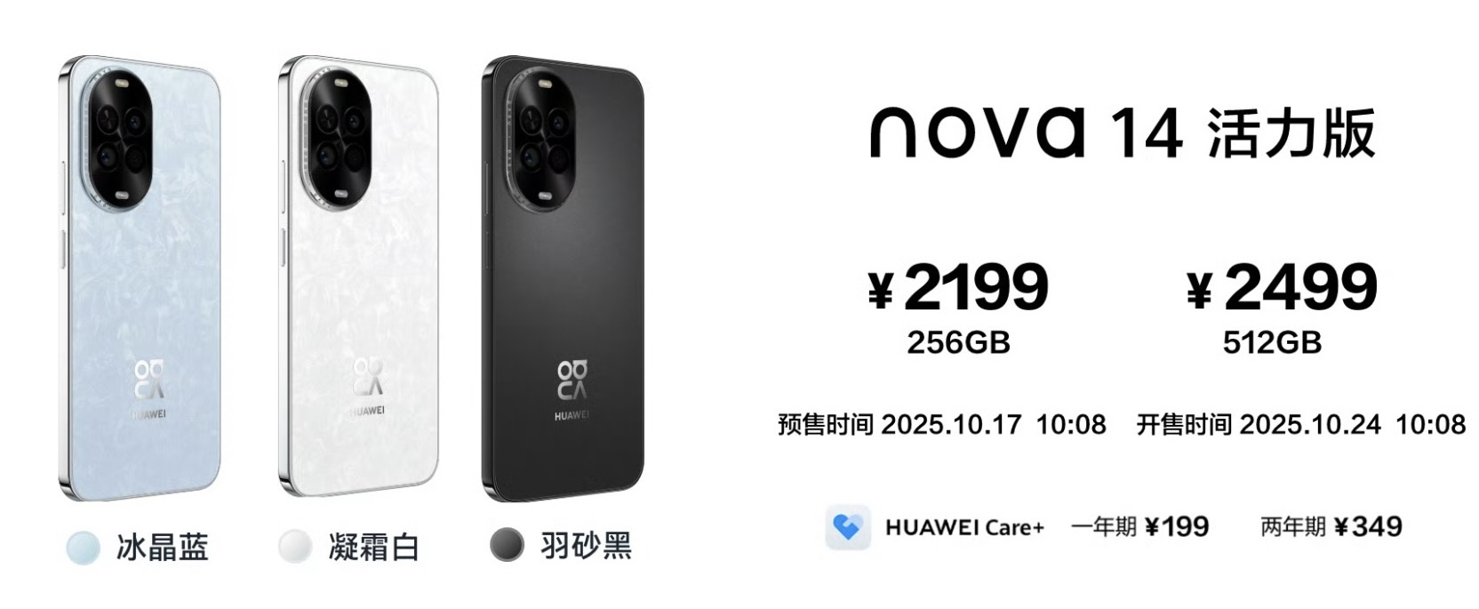 华为nova 14活力版可选三款颜色,256GB和512GB价格分别为2199元和2499元,部分渠道上市价优惠50元。