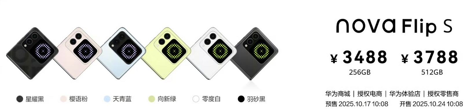 10月17日,华为中端手机上新,两款nova手机已上架,一款直屏的nova 14活力版,一款小折叠nova Flip S,均搭载HarmonyOS 5.1系统,是鸿蒙终端提速的新生力量。
