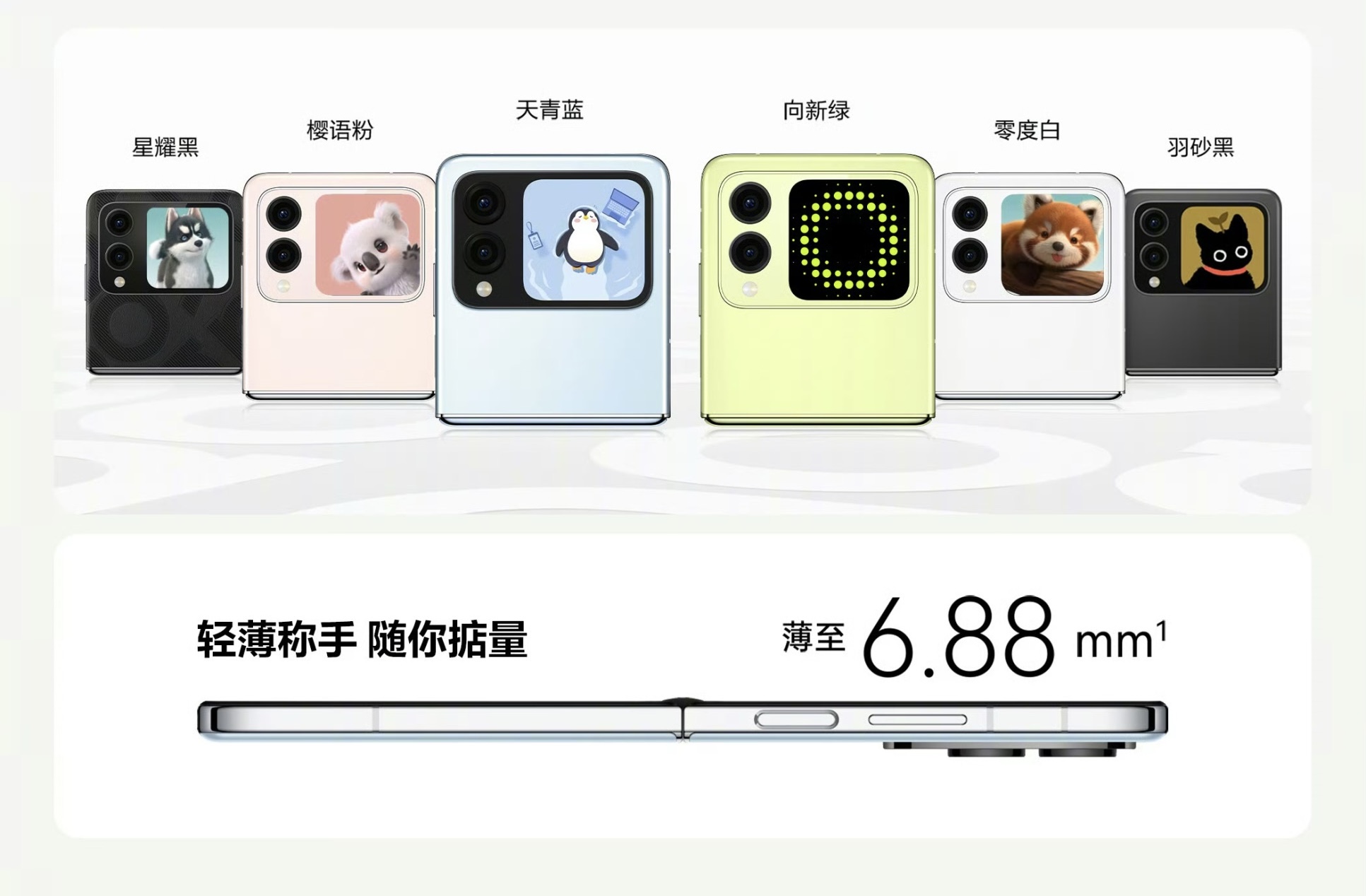 这款小折叠新品有6款颜色,重195克,展开后薄至6.88毫米,内屏6.94英寸,拥有5000万像素主摄和800万像素超广角镜头,外屏2.14英寸,4400mAh电池配66W快充。