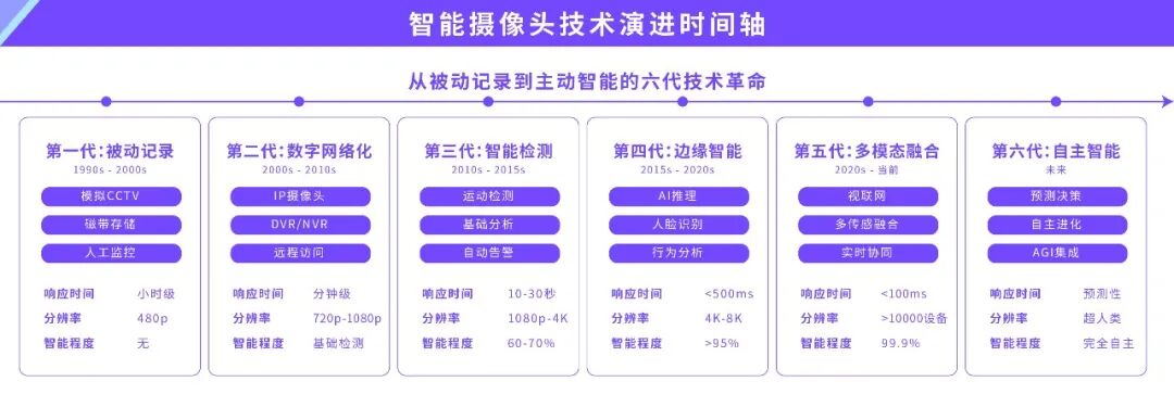 第六代代表着未来的方向——完全自主的智能系统。基于深度学习和强化学习的摄像头将具备预测能力和自主决策能力。它们不仅能够理解当前发生的事情,还能预测可能发生的情况,并自主采取行动。这将是从反应式系统到预测式系统的根本转变。
