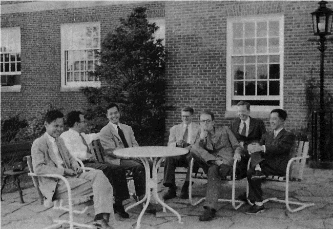 1952年秋杨振宁等物理学家于普林斯顿高等研究院(左起:杨振宁、派斯、李政道、斯诺、爱德华兹、沃德、南部阳一郎)。