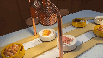 2、 采用回转自取餐模式,20余种餐品,设置15个餐位