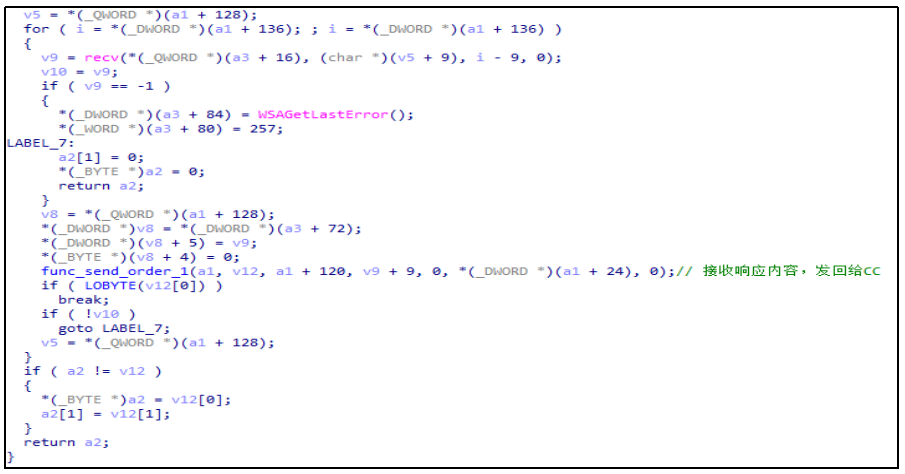 “Back_Eleven”具有主动回连和被动监听两种工作模式:在主动回连模式下,“Back_Eleven”解密内置的主控端控制服务器IP地址,并使用内置的RSA加密算法公钥完成密钥交换,然后使用AES算法将上线信息加密后,利用TLS协议加密传输到主控端;在被动监听模式下,“Back_Eleven”通过监听Windows系统网卡流量,筛选主控端发送的特定条件数据包,实现主控端命令执行。
