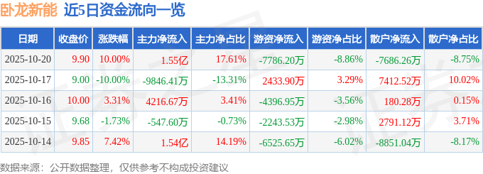 证券之星消息,卧龙新能10月20日涨停收盘,收盘价9.9元。该股于14点38分涨停,2次打开涨停,截止收盘封单资金为7991.34万元,占其流通市值1.15%。
