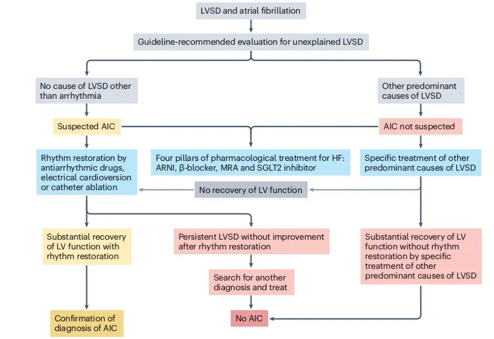 AIC 确诊依赖于恢复正常心律后左心室功能的恢复。对于房颤和心力衰竭患者,节律控制策略已成为心力衰竭治疗的“第五支柱”。节律控制方法包括电复律、抗心律失常药物治疗和房颤消融。长期结果支持减少房颤负荷可改善患者症状和结果,且现代节律控制策略的安全性是其成功的重要因素。早期节律控制的改善主要归因于窦性心律的恢复。AFFIRM 研究表明,窦性心律是房颤患者生存的重要决定因素。在左心室功能降低的患者中,房颤消融是节律控制的有效方法,应尽早采用。EAST-AFNET 4 研究表明,早期但谨慎地使用节律控制的改善依赖于早期、谨慎地使用节律控制,且在随机分配到该策略的患者中,30% 的患者在 2 年后不再需要积极的节律控制治疗。对于房颤消融难以实施的患者,应考虑使用控制心率的药物或消融和起搏治疗策略(图2)。