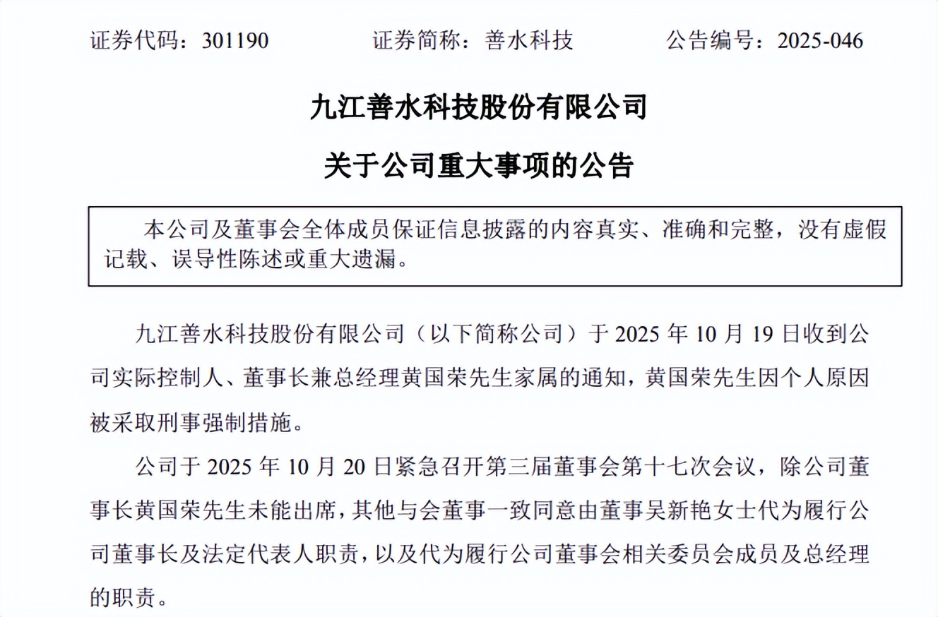 10月20日晚间善水科技(301190)公告,公司10月19日收到公司实际控制人、董事长兼总经理黄国荣家属的通知,黄国荣因个人原因被采取刑事强制措施。