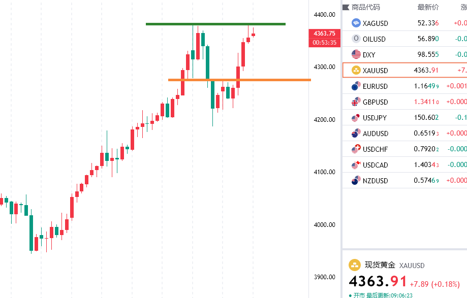 美国政府停摆已持续至第20天,第十一次会议投票继续失败告终,政府停摆也导致关键经济数据发布延迟,市场目前在下周美联储政策会议前陷入数据真空,没有数据公布的时候就会有预期,市场就逐步开始走预期,尤其是美联储降息的预期逐步到达顶峰,另外就是中东再起的战火,无一不是再度给到黄金支撑,在上周五高位跳水之后,上个交易日多头再度卷土重来收复全部跌幅,日线报收一根几乎光头大阳,跟周四形成两阳夹一阴的格局,上个交易日白盘跟大家分享的反弹空兑现到目标位后晚间提示大家回踩接多,思路也是完美得以兑现,日内的话早盘先看高位调整情况,短期多空节奏都可以适当把握,日线级别在4380附近有明显承压,谨慎盲目追涨,目前的行情一切皆有可能!