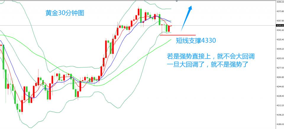操作计划:5分钟级别低点4335——4340附近短线顺势跟多,若欧盘继续拉高并破高,多单持有看4400——4410一线,若欧盘持续承压早盘高点4381一线上不去,美盘前多单调仓离场。短线仍是多头,顺势跟进,但必须做好防守,一旦走弱,并跌破关键支撑区域,必须止损,相对高位,继续上涨空间比较有限,但一旦走回调,又是单日100多200美金的幅度,做错了,可以再做,一旦死扛,错一次,就万劫不复。