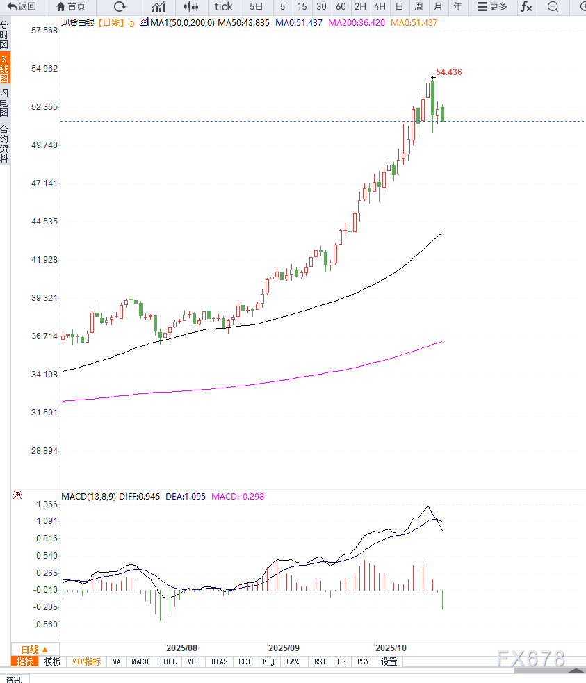 同时需留意美国 CPI 数据对市场情绪和美元走势的影响,以判断白银后续波动方向。汇通财经APP讯——白银在亚洲盘延续回调,日内跌至约 51.50 美元/盎司。随着全球贸易紧张缓和以及风险情绪回暖,白银面临获利回吐压力。