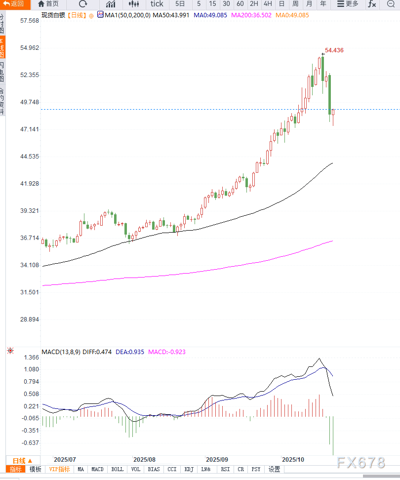 下方支撑位关注近期低点47.53美元、10月2日低点45.90美元及9月25日低点43.78美元;若突破这些支撑,白银可能进一步承压。