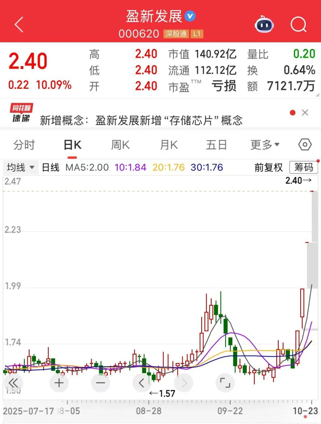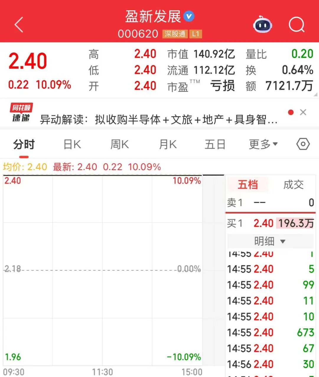 今日,盈新发展“一字”涨停,收获“四连板”。