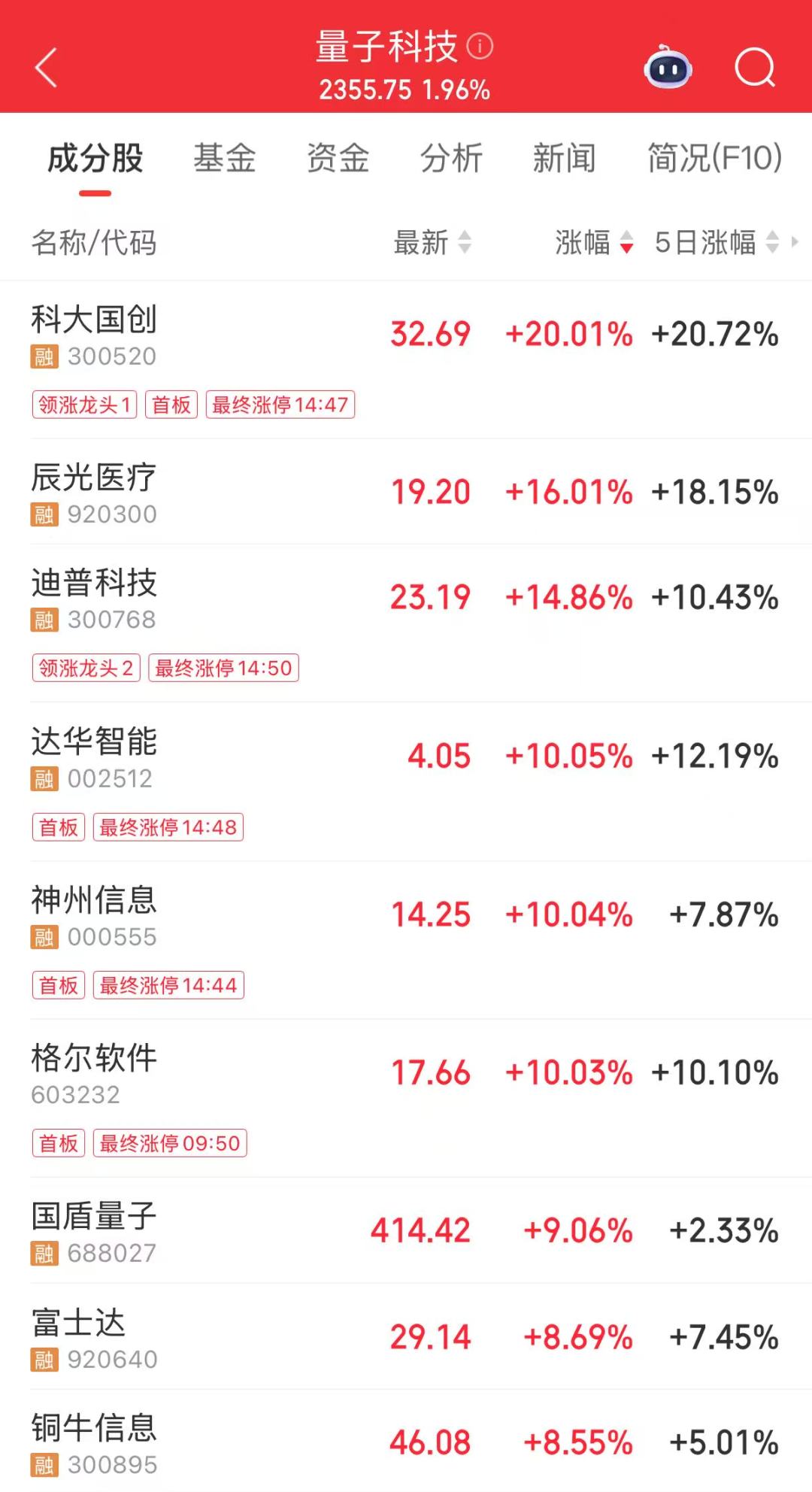 尾盘,量子科技板块直线拉升。科大国创“20CM”涨停,达华智能、神州信息直线涨停,迪普科技、辰光医疗、国盾量子等跟涨。