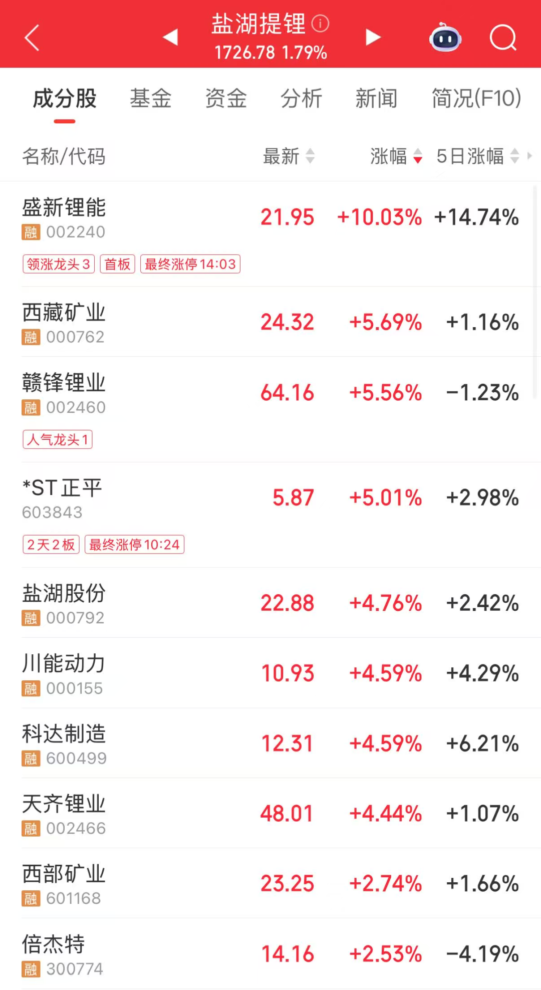 盐湖提锂板块尾盘走强,盛新锂能涨停,西藏矿业、赣锋锂业、盐湖股份涨幅居前。广期所碳酸锂主连合约收盘上涨4.17%,创9月以来新高。
