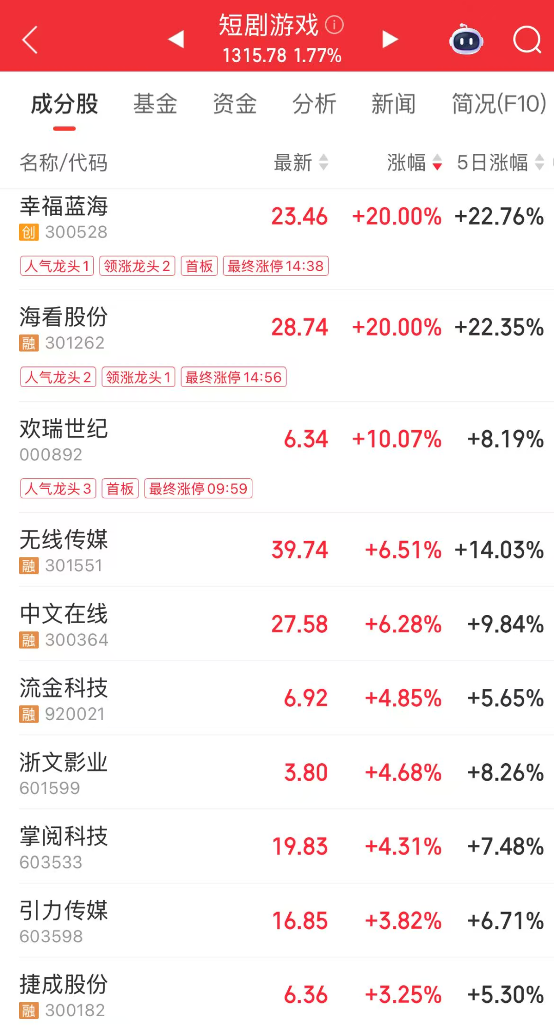 今日,短剧游戏板块走强。幸福蓝海、海看股份“20CM”涨停,欢瑞世纪涨停,无线传媒、中文在线等跟涨。