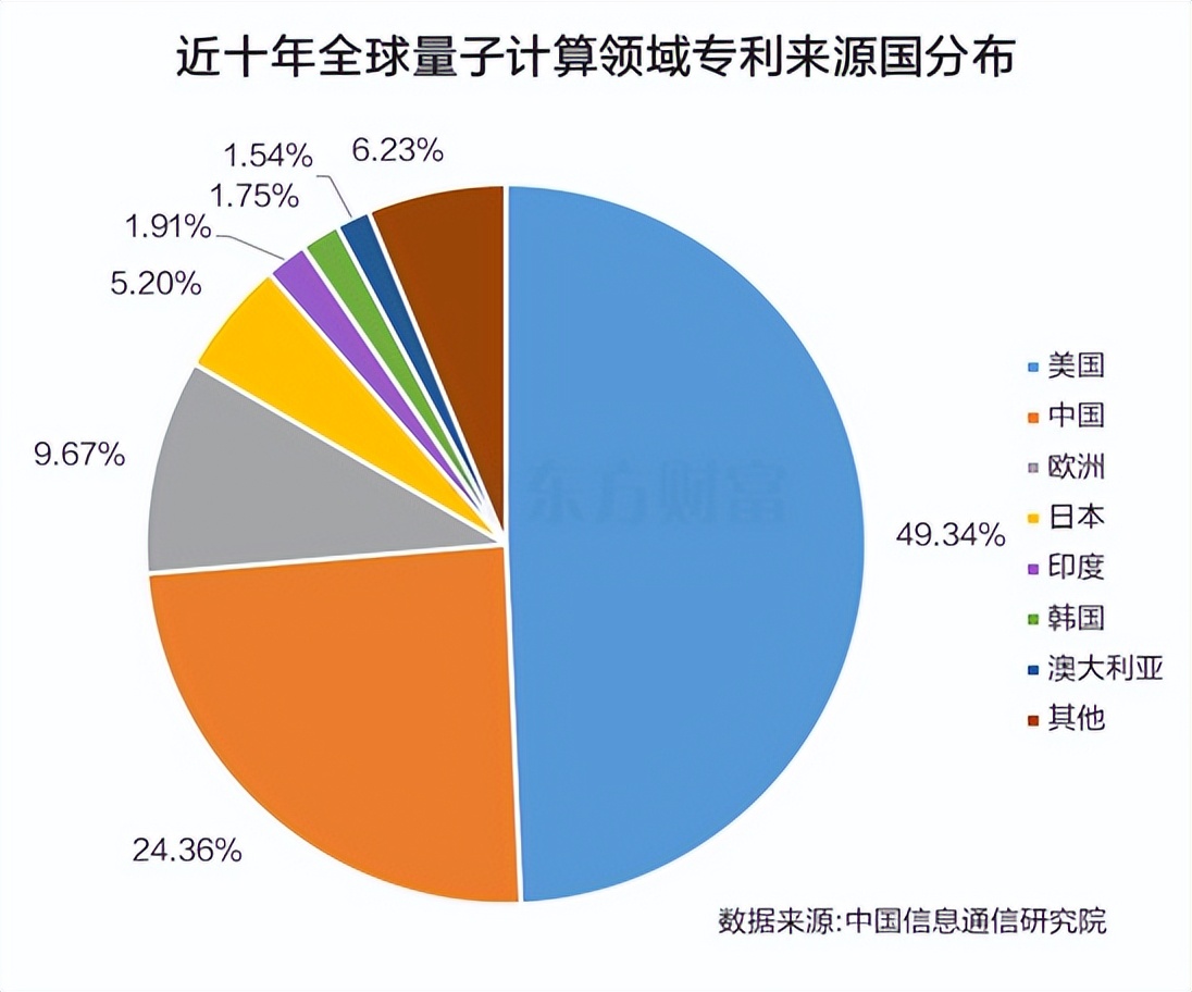 而从过去十年全球量子计算领域专利技术来源国看,美国占了49.34%,中国占了24.26%,欧洲以9.67%排在第三位。