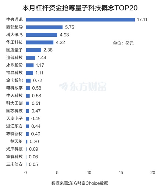 一段时间以来,量子科技板块持续走强,10月9日盘中还创出过历史新高。从杠杆资金角度而言,国庆节后合计净流入量子科技板块25.55亿元。其中融资净买入中兴通讯最多,为17.11亿元。西部超导被融资净买入5.75亿元,科大讯飞、华工科技分别被融资净买入4.93亿元和4.32亿元。