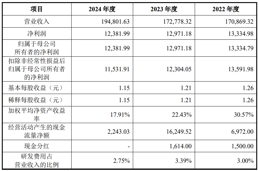 财务方面,于2022年、2023年及2024年,公司实现营业收入分别约为17.09亿元、17.28亿元、19.48亿元人民币;同期净利润分别约为1.33亿元、1.30亿元、1.24亿元人民币。丰倍生物称,2022年至2023年经营活动现金流量情况良好,2024年经营活动现金流量净额有所下降,主要是经营性应收项目余额增长所致。
