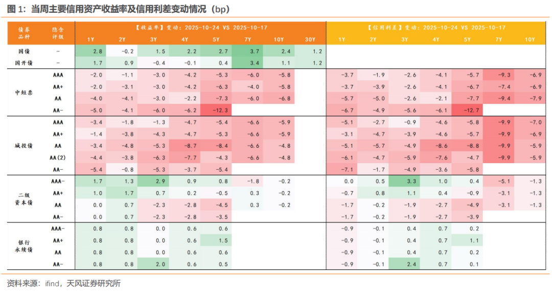 大会期间资金平稳叠加关税摩擦、股债跷跷板效应,利率债小幅调整:截至10月24日,10年、30年国债收益率较10月17日分别上行2.4bp、1.2bp。