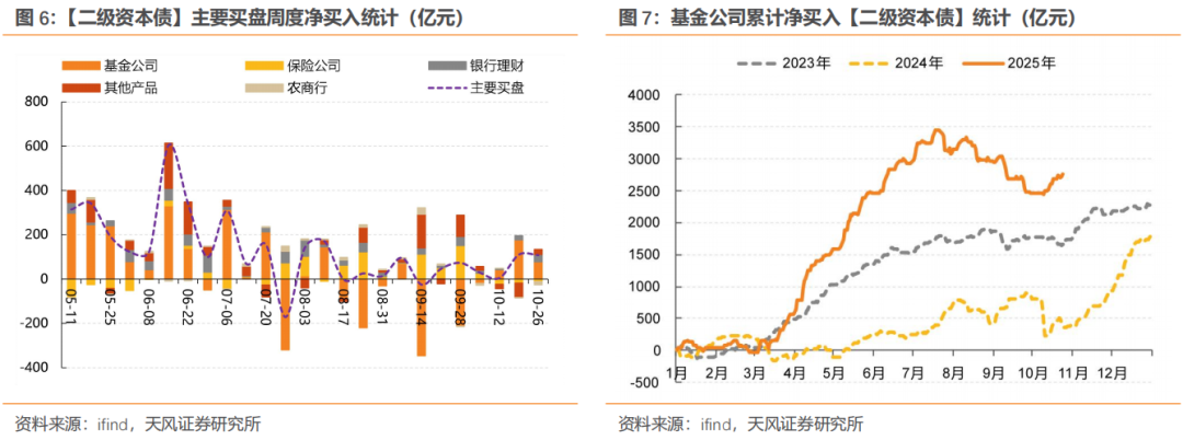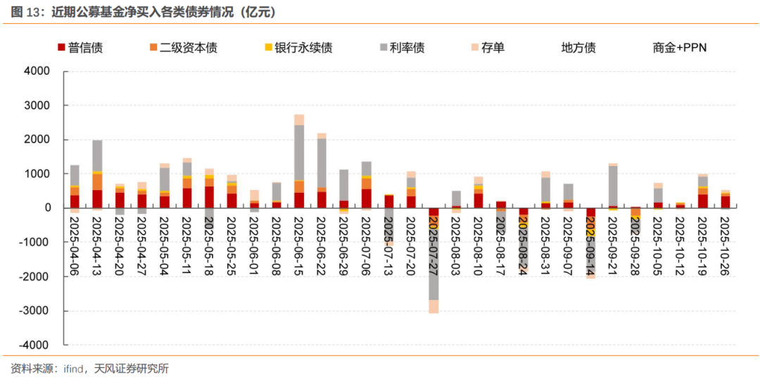 而此轮信用利率背离的背后,更多还系资金力量驱动,经过前期调整后的信用票息价值有所显现,公募基金、理财均不同幅度加大对信用债的买入力度,对利率债的净买入力度相对较弱。