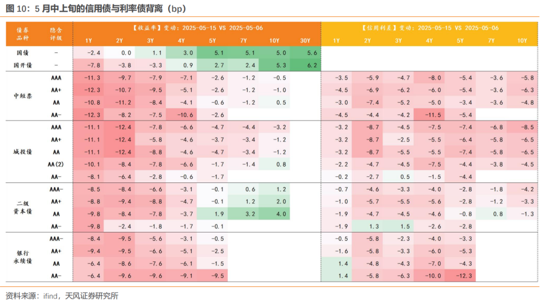 5月上旬:一揽子货币政策出台,央行降准降息兑现,一定程度在节奏上超出市场预期,带动资金利率中枢下移,进而推动信用债大幅走强,尤其是短信用。