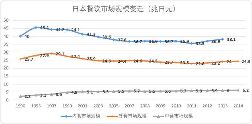 如果从1985年开始算,二十年间整整下降了约20%。在这种情况下,“内食”(在家做饭)和“外食”(外出就餐)双双缩水,“中食”(快餐与便利店食品)则逆势增长三倍。