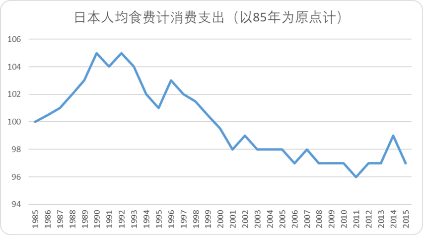 长期以来,受食材自给率低下、人工成本偏高的影响,日本餐饮消费的价格相对较贵,外出就餐的成本自然也高。原本经济的繁荣让居民普遍乐观,他们不在意这部分支出,就连奢侈品消费也空前膨胀。但自从进入“失去的三十年”,日本的人均收入开始逐渐下滑,和所有消费品一样,餐饮客单价在泡沫破裂后也悄悄“缩水”。