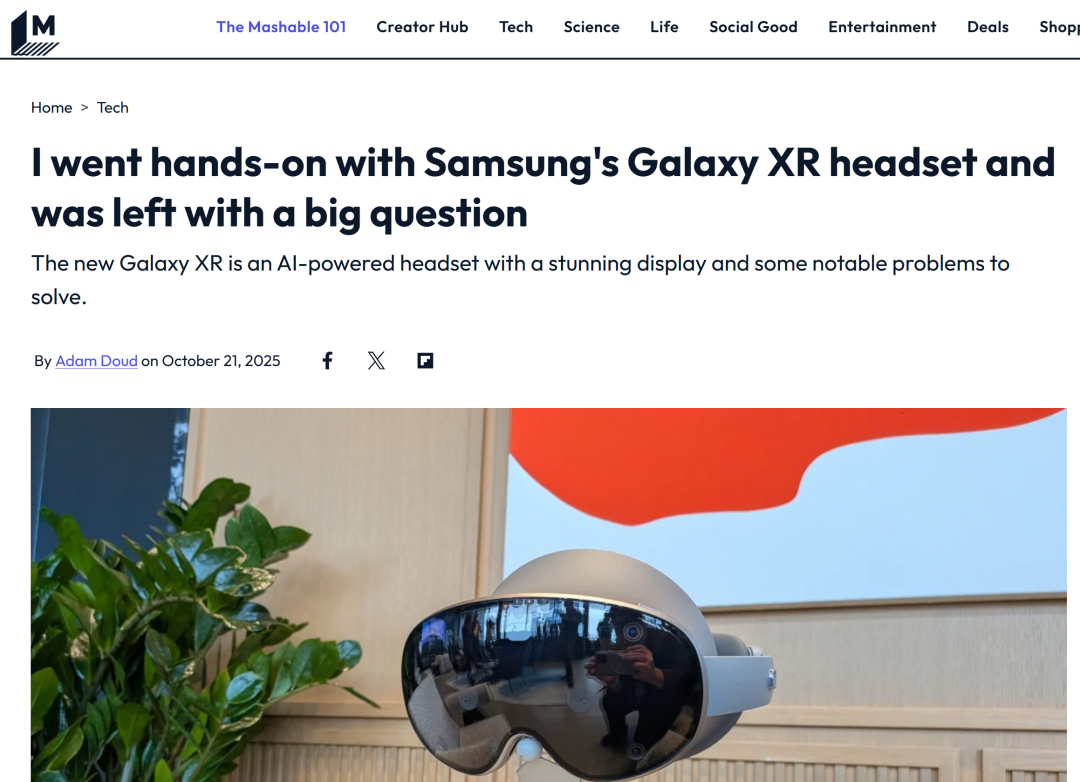 文章标题很直接:"我体验了三星Galaxy XR头显,但留下了一个大问题"(I tried the Samsung Galaxy XR headset and I'm left with one big question)。