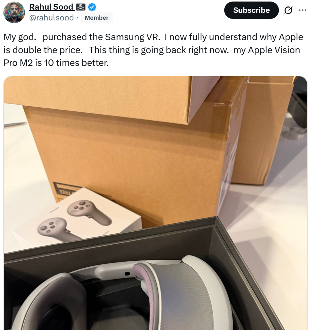 "OMG! I got the Samsung VR. Now I understand completely why Apple doubled the price. This thing is being returned now. My Apple Vision Pro M2 is 10x better than this."
