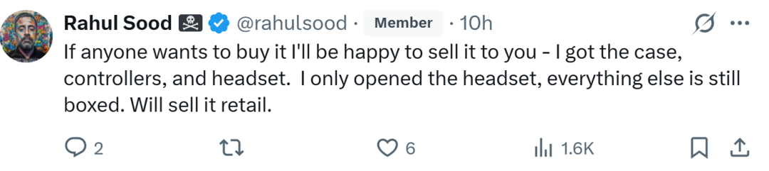 "如果有人想买,我乐意原价转给你——我有盒子、手柄和头显。只开了头显,其他都还在盒子里。原价出售。"