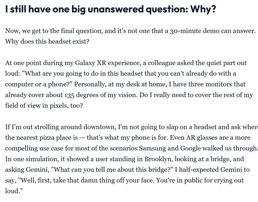 原文:"Even AR glasses are a more compelling use case for most of the scenarios Samsung and Google walked us through."