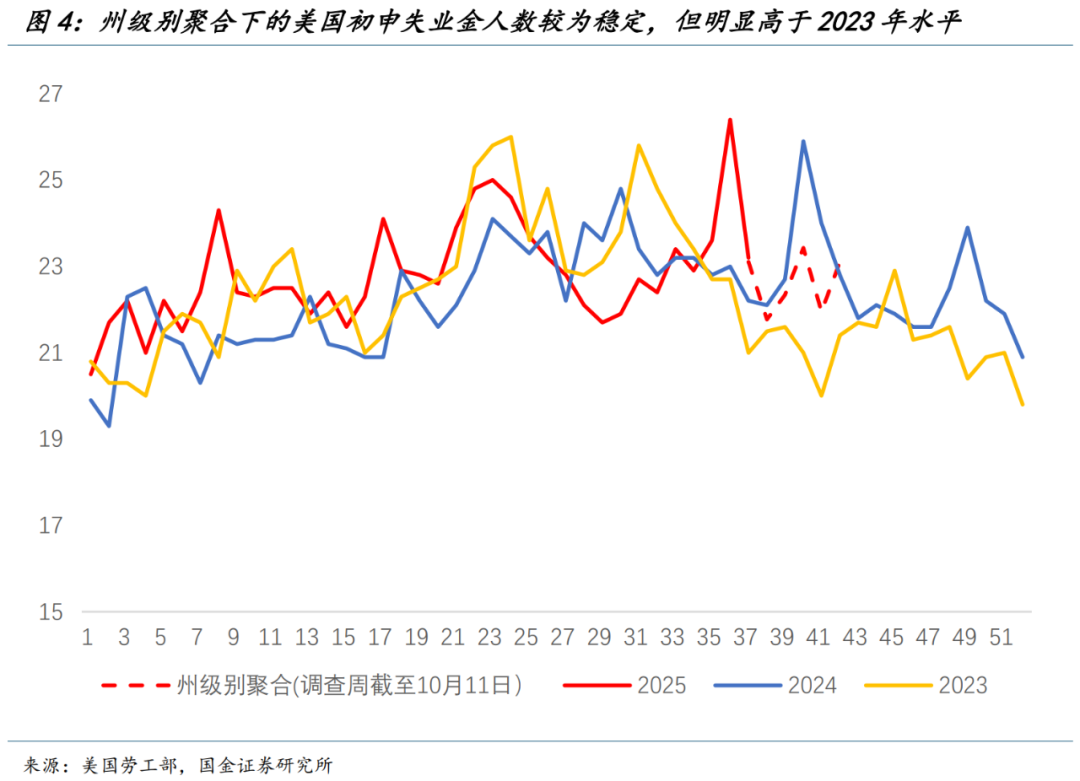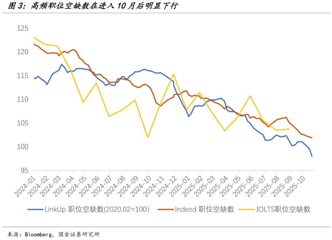 例如,9月小非农ADP在经过基准调整后录得-3.2万人,过去四个月月均新增就业仅为1.1万人;而高频职位空缺数在夏季小幅反弹后,9月至今再度走弱。
