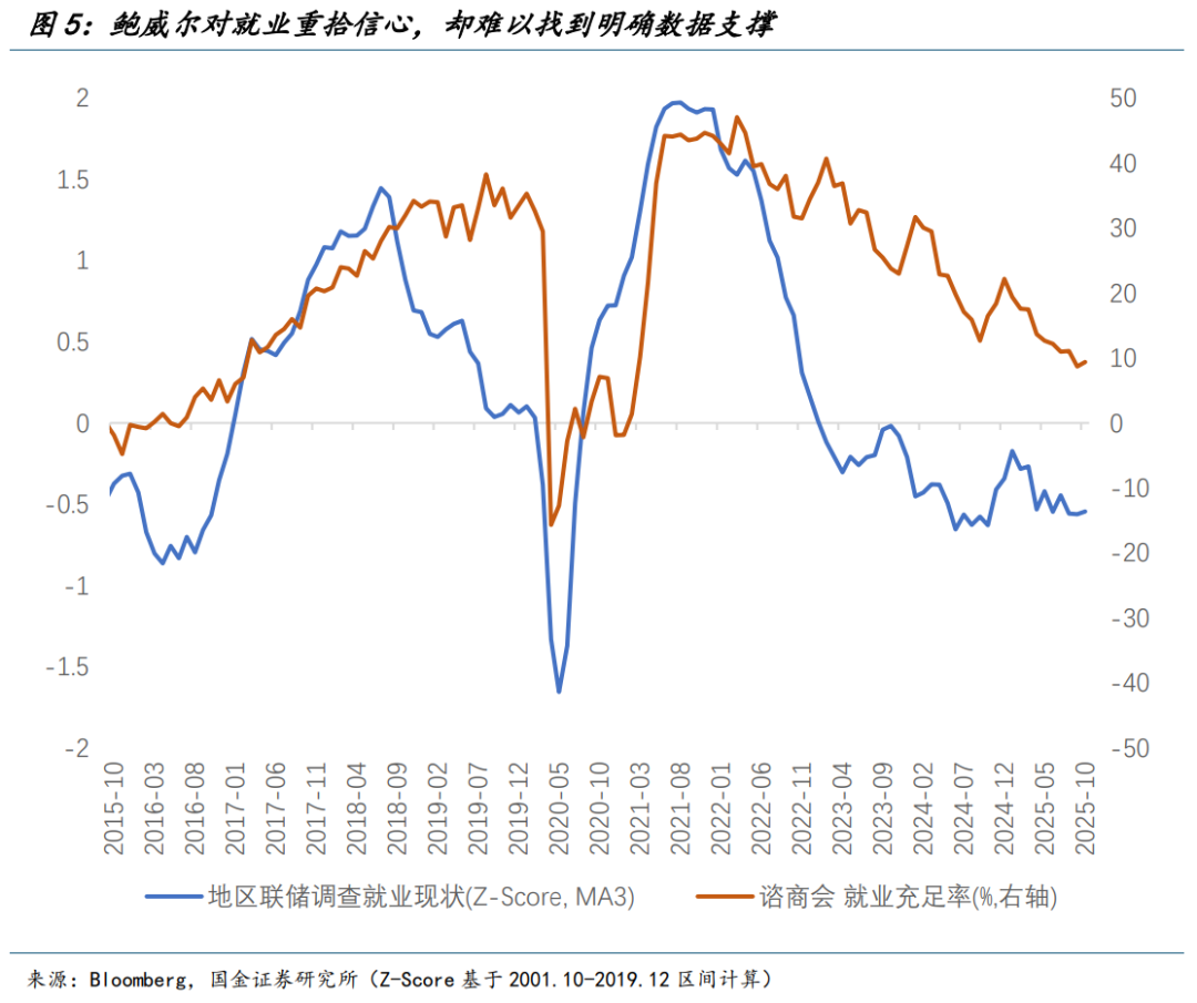 鲍威尔表示部分委员开始更加关注劳动力的下行风险是否“真实存在或仍在加剧”,他认为当下就业趋势并未进一步走弱,尤其提到了职位空缺数以及失业金申领人数。但他所提到的数据都在进一步走弱而非企稳,这似乎应该支撑12月降息的发生。